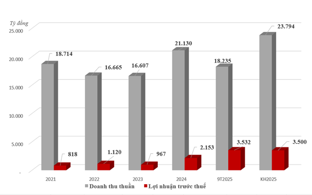 Lũy kế 9 tháng, doanh thu thuần GELEX Electric đạt 18.235 tỷ đồng, tăng 24%; lợi nhuận trước thuế đạt 3.532 tỷ đồng, tăng tới 162%. Doanh nghiệp đã nâng mục tiêu lợi nhuận trước thuế năm 2025 lên hơn 3.500 tỷ đồng – tăng 108% so với kế hoạch cũ – và chỉ sau 3 quý đã vượt kế hoạch mới.