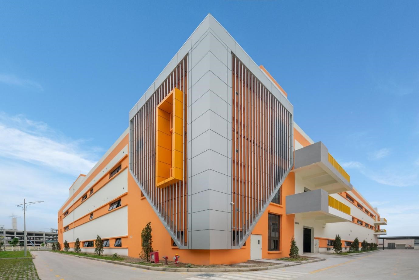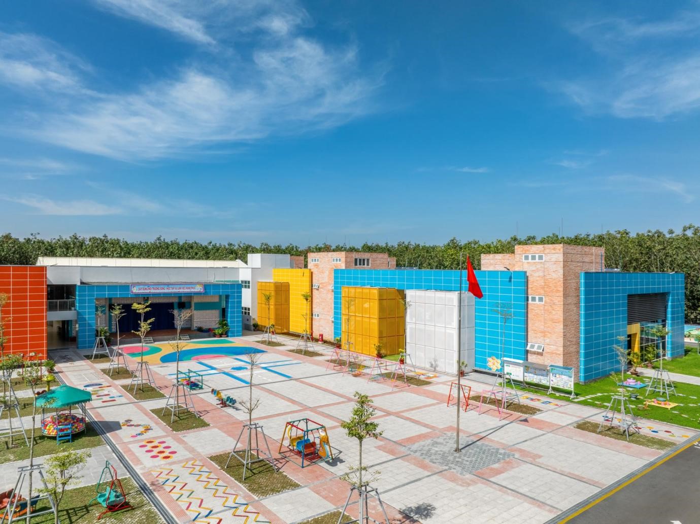 Trường Mầm Non An Lập sử dụng tấm alu ngoài trời Alcorest trang trí mặt tiền khuôn viên trường mang lại kiến trúc tươi trẻ và hiện đại.